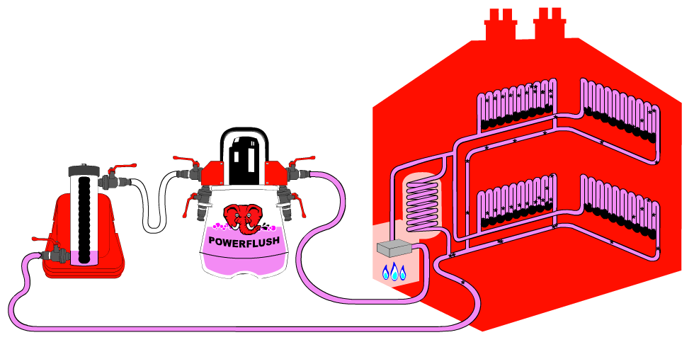 The power flushing pump is connected to the system across the flow and return pipework specialist chemicals are pumped at a higher than usual velocity across each radiator individually and through the hot water cylinder coil. The result is the magnetite, more commonly known as sludge, slowly being broken down and suspended in the rapidly moving water. All debris and corrosion is then dislodged by the flow generated by the pump. This water is then passed over two large magnets in the flushing machine which mobilise the unwanted debris and prevent it from being reintroduced into the system. The dislodged debris and corrosion is then flushed through the pump’s drain. At the same time, the pump fills the system with fresh water from the connection to the cold water main. Then the pH levels in the system is neutralised and a corrosion inhibitor is added and circulated throught the system to improve efficiency, help extend the life of the system and prevent future blockages.