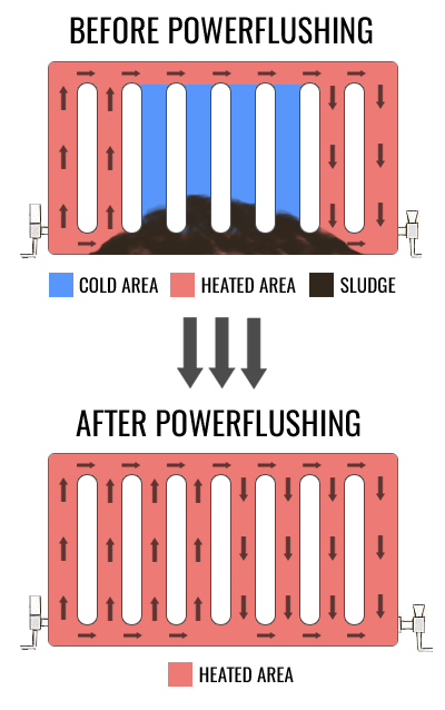 Radiators that are cold or partially cold are often this way because there is sludge trapped in them. The sludge tends to sink to the bottom of the radiator. This is why radiators can sometimes feel cold at the bottom and hot at the top. If the sludge is removed by power flushing, then the water is able to circulate around the whole radiator rather than just the top part of that radiator.
